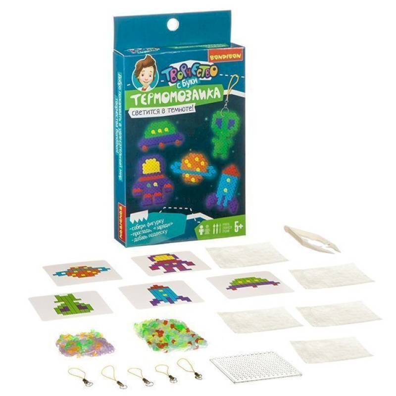 Термомозаика - очень увлекательный и популярный вид детского творчества. В этом наборе от Бондибон есть все, чтобы сделать эффектные подвески-брелоки, которые к тому же будут светиться в темноте! В…