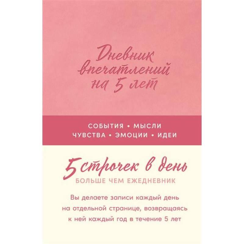 Дневник впечатлений на 5 лет создан для того, чтобы вы могли записывать что-то особенное о каждом дне. Хотите ли вы зафиксировать свои достижения, мысли, идеи или красоту момента, оставить на будущее важные размышления, заметить перемены и задуматься о главном - дневник идеально для этого подойдет.