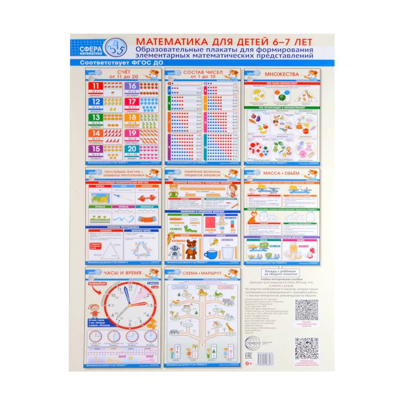 Плакаты имеют удобный формат А3, в них системно представлен материал основных разделов математических знаний: количество и счёт, геометрические фигуры, величина, ориентировка во времени, ориентировка в пространстве.
